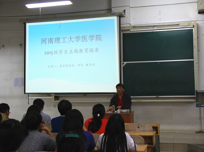 新生入学主题教育作为大学生人生规划的重要环节,对引导学生树立远大目标、坚定理想信念、培养人文情怀具有极其重要的意义。10月13日下午,医学院召开了2015级新生主题教育报告会。报告会由医学院院长、党委书记韩冬风主讲,党委副书记时洋主持,医学院党政领导、全体教师参加了报告会。