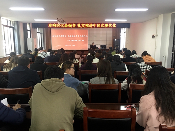 为深入学习贯彻落实党的二十大精神,让党的二十大精神在基层落地生根、开花结果,3月7日下午,学院邀请学校党的二十大精神专题宣讲团专家王家涛作题为《奏响时代最强音 扎实推进中国式现代化》专题宣讲,宣讲会由学院党委副书记杜小保主持,学院全体教职工参加。