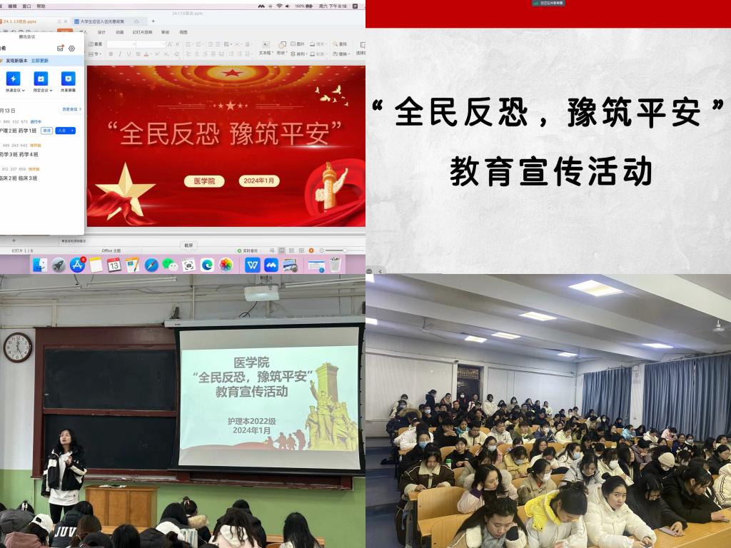 我院高度重视“全民反恐,豫筑平安”反恐怖宣传教育进校园主题活动,通过线上线下主题班会,鼓励医学院学生积极参与并宣传,引导学生认识恐怖主义活动、抵制恐怖主义思想、掌握反恐技能。通过本次主题班会,希望全体师生共筑反恐防线,远离恐怖主义侵害,切实维护国家安全和校园稳定。