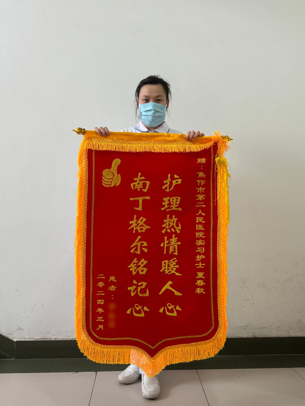 春满人间的三月,河南理工大学医学院护理学专业大四实习生夏春秋同学在实习医院收到了一份特殊的礼物。河南理工大学第一附属医院骨科一区的患者郭某,将一面“南丁格尔铭记心,护理热情暖人心”的锦旗挂到了科室门口。这面锦旗不仅是对夏春秋同学的赞扬,更是对整个医护团队的认可和鼓励。