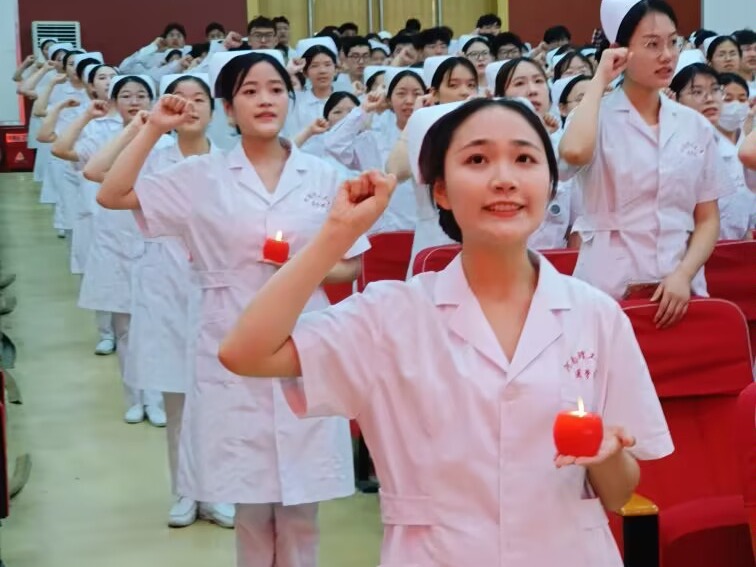 大会最后举行了庄重的授帽传光仪式。在庄严的乐曲声中,护理前辈们为护生们戴上象征圣洁的燕尾帽,并传递红烛,象征着护理精神的传承。护生们庄严宣誓,表达了她们献身护理事业、奉行人道主义精神、坚守救死扶伤信念的决心。
