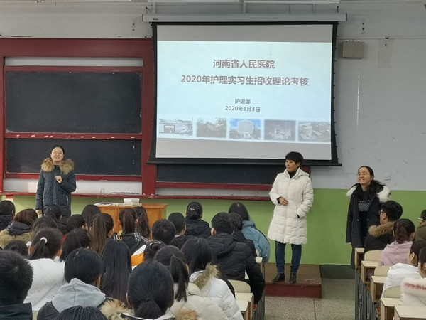 2020年1月3日上午,河南省人民医院来我院面试选拔2021届护理专业实习生,面试在2202教室举行。本次参加面试的学生包括我院的2017级护理本科、2018级护理专科生及河南理工大学鹤壁工程技术学院的2017级护理本科生,共122名学生。