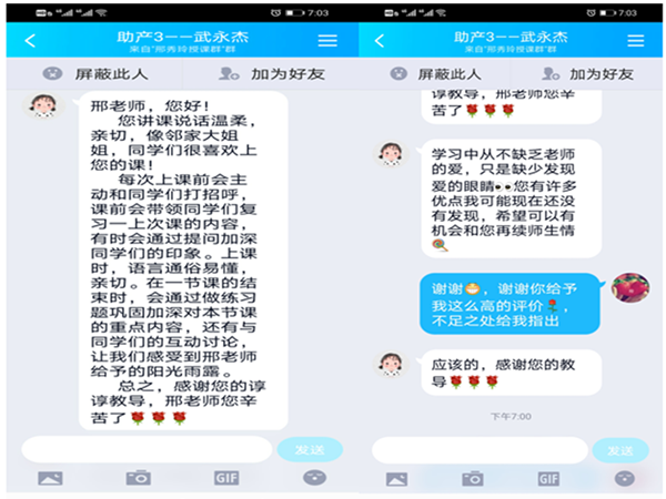 在进行线上教学过程中能及时与学生沟通交流,不断收到学生发来的反馈留言,从而用最短的时间改进自己线上教学存在的不足之处,以取得线上教学的最佳效果。如邢秀玲老师的课堂每次线上直播会提前10分钟或利用课间休息时间播放医务人员抗击疫情的故事、诗歌、歌曲和脱口秀等来鞭策、激励、引导学生,受到了学生的一致好评,学生反馈如下:播放视频《暖暖的中国》,当陈铭脱口秀讲到当被感染的人数越来越多时,当更严重的病例的增多,医疗物资也快没有了,这时中国各省区纷纷向武汉捐赠医疗物资,还为武汉派出支援的医生,一方有难八方支援,一声声“我来,我来”这一壮举让我们激动和感动;当看到视频里一个一个白衣天使们恪尽职守、临危不惧,穿梭在生死之间,用自己的生命挽救他人的生命这些鲜活的画面时,使我们重新认识自己,我们懂了,他们就是生命的守护神,他们在新型冠状病毒面前,逆行而上,把个人安危置之度外,他们是最伟大的人;当我们进入直播课堂后,首先听到《白衣长城》歌曲,看看画面“信念”“使命”“使命在肩,八方驰援”时,我们热血沸腾,感受到中国的力量,为自己是一名中国人而自豪。作为一名在校医学生,要向他们致敬,以他们为榜样也要做一个向她们那样的人!学生还反馈了王丹、郝双影、翟彩红等多位老师无论课上和课下都能积极热情的和学生沟通,及时解决学生提出的疑问和存在的问题。