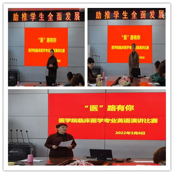 为更好体现学业导师履行“立德树人,学业指导,学术指导,规划指导”四大职责,3月7日下午基础医学部在医学院223会议室举办了第一次“‘医’路有你”英语演讲比赛。2021级临床医学专业导师指导部分学生参加了英语演讲比赛。