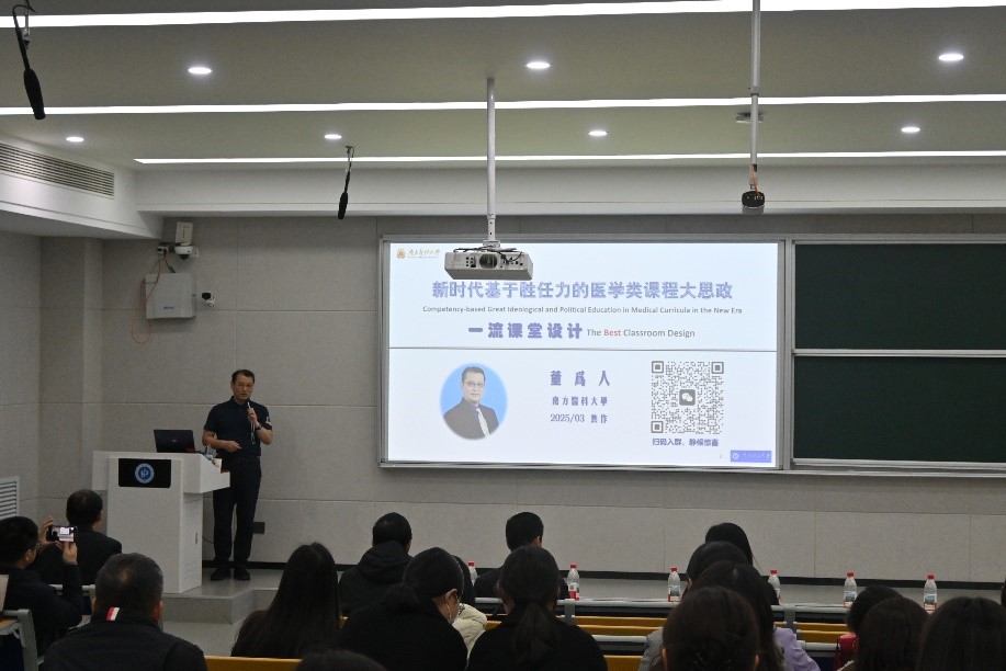 3月29日上午,董为人教授在3105报告厅作了题为《新时代基于胜任力的医护课程大思政一流课堂设计》的专题讲座。副校长丁亚红、人事处(教师中心)、医学院全体教师、各学院教师代表及第一附属医院教师等近150人参加。董教授结合自身多年教学科研经验,深入浅出地讲解了一流课堂设计的方法与技巧,并强调了将思政元素与专业知识有机融合的重要性。他从思政理念、医学人文、文史哲美、时代精神、职业科学素养等多角度阐述了“新时代医护课程大思政设计”的内涵与实践路径。精彩的报告内容引发了参会教师的强烈共鸣,现场气氛热烈。