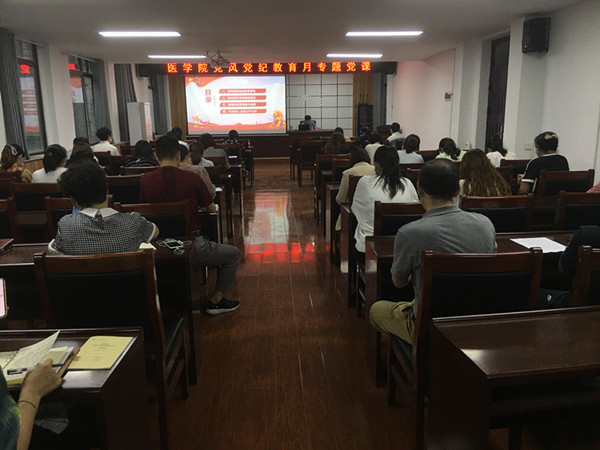 余本胜结合学院工作实际从党风廉政建设的重要性、如何抓好党风廉政建设、反复的重要措施和成果、不忘初心,全面从严治党等四个方面进行了详细讲授。余本胜强调坚定理想信念,加强党性修养,永葆政治本色,不断提高廉洁自律拒腐防变能力,是全体共产党员特别是党员领导干部的终生课题。希望全体党员能倍加珍惜为党和人民工作、为社会主义事业发展添砖加瓦的良好机遇,倍加珍惜党组织和人民群众的信任和期盼,永葆共产党人的政治本色,时时处处严格要求自己,以更高的思想境界、服务意识、崭新的精神面貌,为医学院工作迈上新台阶作出积极的贡献。