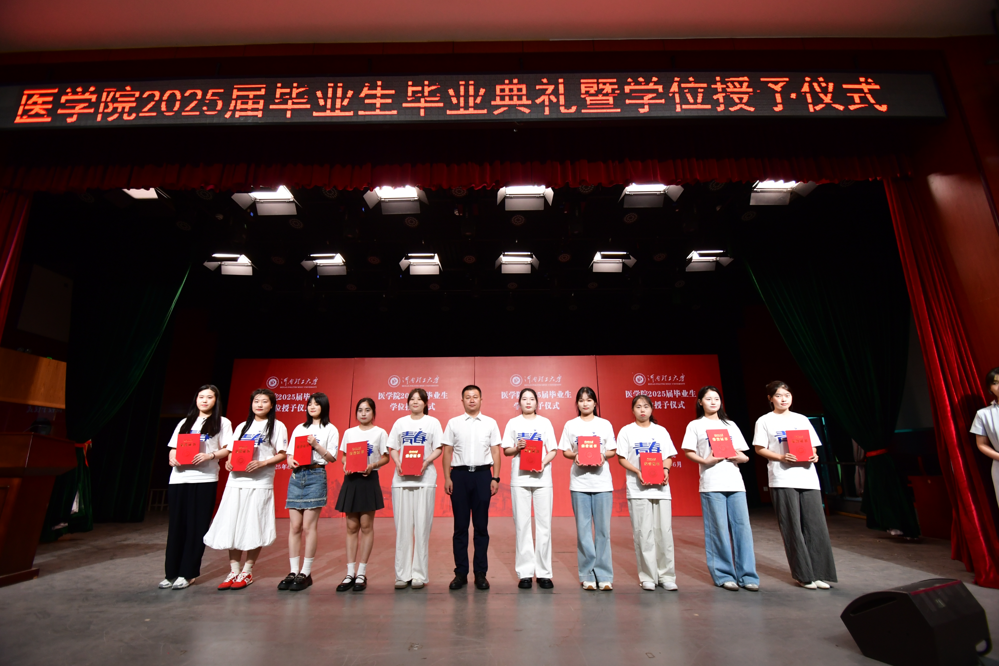 仪式中,张向锋为获得河南省2025年优秀应届毕业生的学生颁奖,王振辉为2025年医学院毕业生益禾奖学金获得者颁奖,表彰他们德智体美劳全面发展的卓越表现。最后,学院领导为毕业生授学士学位,身着学士服的庄重是对学业圆满的印证,学士帽流苏的流转更蕴含着母校对学子未来发展的深切期许。