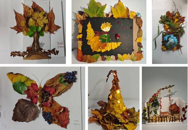 本次“捡秋”创作,是医学严谨与艺术浪漫的巧妙融合。学子们以秋叶、野果、枯枝为素材,通过剪、拼、绘、编等技法创作出多样作品:银杏叶与松针编织的礼帽兼具雅致与实用,枯枝搭建的迷你庭院衬以苔藓红果复刻秋日静谧,落叶拼贴的蝴蝶与落日大树则将自然质感与艺术想象融为一体。每一件作品都彰显着对生活之美的敏锐捕捉与巧思创造。