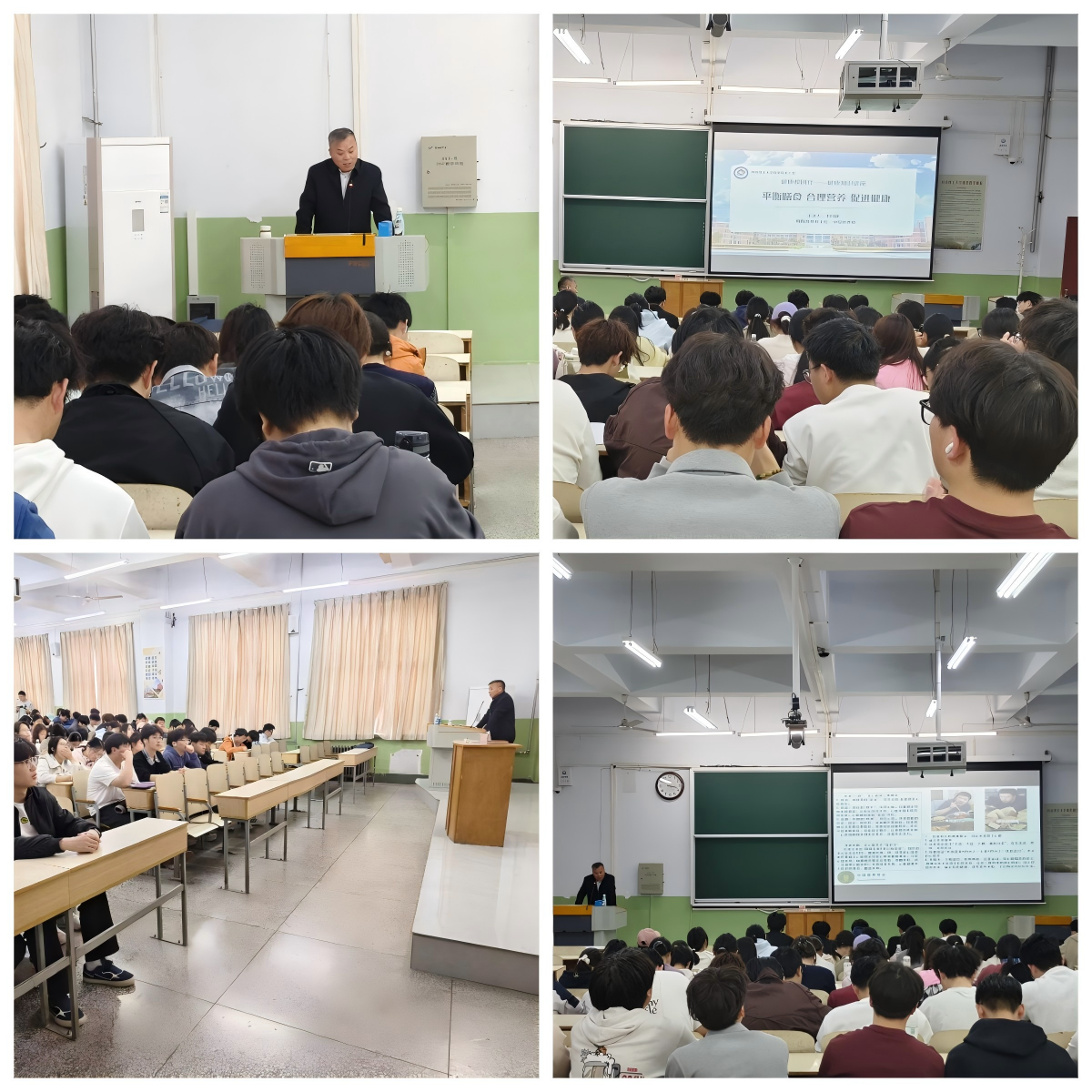 讲座中,李同静主任结合《中国居民膳食指南(2022)》核心准则,用通俗易懂的语言、贴近校园生活的案例,围绕平衡膳食、科学搭配、营养误区、日常健康管理等内容展开细致讲解。他从大学生日常饮食特点出发,重点讲解了三餐合理配比、营养素摄入、控糖控油、规律作息与饮食的关系,针对新生常见的挑食、节食、外卖依赖、熬夜加餐等问题给出科学指导,帮助大家建立“营养均衡、健康第一”的饮食理念。同时,他结合自身专业擅长,分享了慢性病防控、健康生活方式养成等实用知识,现场互动热烈,同学们积极提问交流。