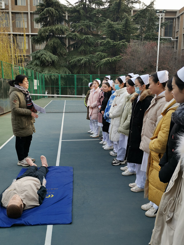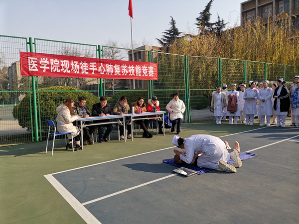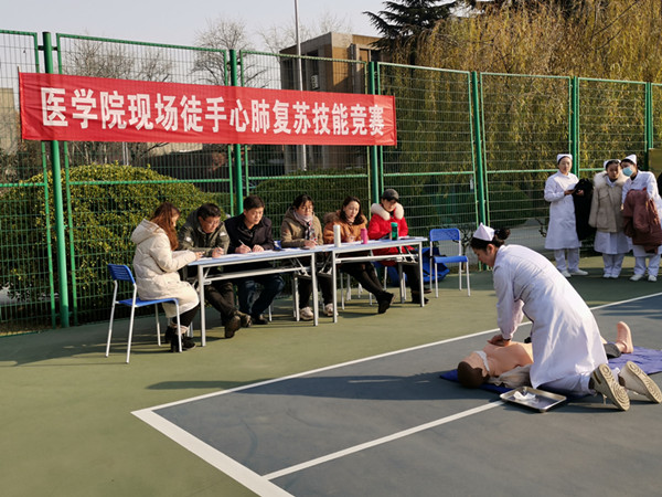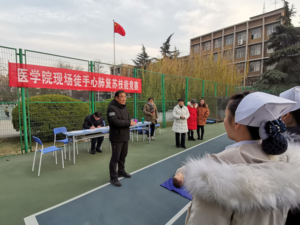 虽然时值隆冬料峭,零下几度的气温挡不住选手参赛的热情。比赛现场,选手们一个个规范着装、沉着冷静、语言精炼、操作娴熟、流程规范。从评估现场环境是否安全,轻唤“病人”,判断生命体征,呼救求助到开展心肺复苏营救,比赛氛围紧张有序,赢得了评委老师的一致肯定和好评,赛后,评委老师也进行了多角度的点评。比赛中医学院原院长、沈院长、杜书记等都前来观看,赛后原院长语重心长的对同学们提出了期望和要求。