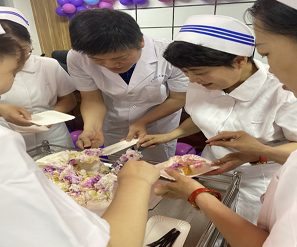 最后,在舒缓的音乐中两位年轻的护理系教师手推着放有三层蛋糕的治疗车款款而来,蛋糕上安然的天使,闪烁的烛光,轻盈的羽毛不仅带给在场的师生意外的惊喜,也表达着医学院领导班子对护理系师生深深的节日祝福。