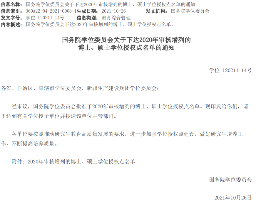根据国务院学位委员会《关于下达2020年审核增列的博士、硕士学位授权点名单的通知》(学位〔2021〕14号),在2020年开展的博士硕士学位授权审核工作中,我院申请新增生物与医药专业硕士学位授权点获得批准。