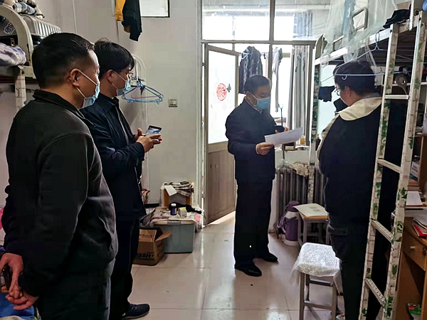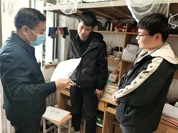 朱建光来到北校区八号楼学生公寓,先后走进针推专业和药学专业的多个宿舍,查看宿舍环境,并与学生亲切交谈。他仔细了解同学们当前的线上学习和生活情况,询问有没有困难及对学校的意见建议,对同学们严格遵守学校的疫情防控规定提出明确要求,并对大家的就业、考研等给予指导、表达殷切期望。