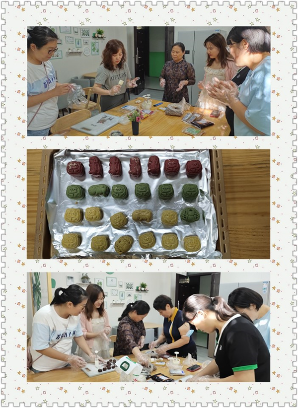 活动开始时,擅长面点制作的牛超老师带来了事先和好的面与食材,向大家详细地演示、介绍制作月饼的技巧和过程。随后大家开始分工合作,参加活动的教师大多数是第一次亲手制作月饼,她们兴趣盎然、跃跃欲试。在老师说可以开始制作时,就迫不及待地拿起了原材料和工具,称重、压皮、包馅、捏皮、最后放进各种花样的模具之中按压定型。按照老师教的步骤一步步完成,每个步骤有条不紊。一个个面团摇身一变,变成了一个个拥有可爱造型的小月饼。在欢声笑语中,大家发挥团结互助精神,分享自己的方法和经验,做的月饼一个比一个好看,场面热闹,气氛融洽。小小的月饼,承载了浓浓的情谊。当看到一个个漂亮的月饼在自己的手中诞生时,大家都异常兴奋和自豪。经由简单的烘培,月饼的甜香填满了整个教师活动室。月饼新鲜出炉上桌后,搭配上精美的礼品袋子,大家表现出大大的满足感、成就感。