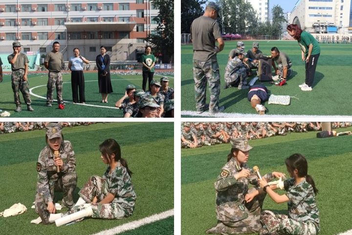 活动开展前,医学院、武装部及军训教官多次沟通交流,有条不紊地进行了大量前期筹备工作,包括材料准备、模型准备、人员分工、场地安排等,以确保活动顺利开展。活动过程中,宣讲团首先进行了战地医疗救护方面的培训,演示了不同受伤部位的包扎技巧,详细介绍了急救包的使用方法、包扎伤口的步骤与相关注意事项等,耐心纠正了实操环节学生的错误动作和不当操作,帮助同学们更好掌握自救互救的基本知识与技能。接着,宣讲团为新生进行了心肺复苏急救法的培训,在简单介绍了心肺复苏的概念、适用人群、时效和步骤四个方面的基本急救知识后,针对心肺复苏主要环节,如“复苏体位”、“胸外按压”、“人工呼吸”、“开放气道”等操作细节进行了细致地描述,最后,宣讲员通过模型人体演示了心肺复苏的详细步骤,耐心讲解了各个环节的操作要领及注意事项。