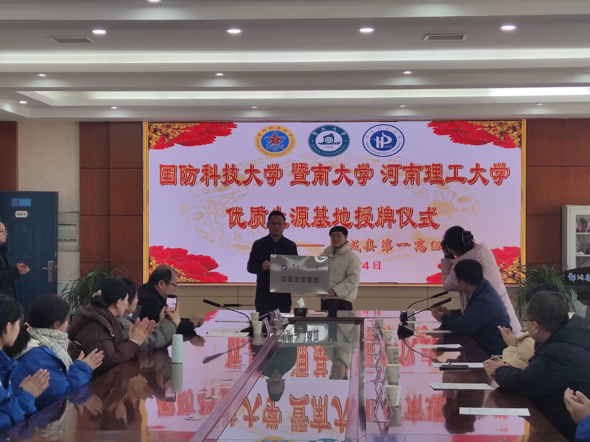 12月24日,周口郸城县第一高级中学在综合办公楼601会议室隆重举行国防科技大学、暨南大学、河南理工大学等三所高校优质生源基地授牌仪式暨招生宣讲会,由党委书记、校长刘成章作了热情洋溢的致辞,部分师生代表参加。仪式由办公室主任王雪涛主持。