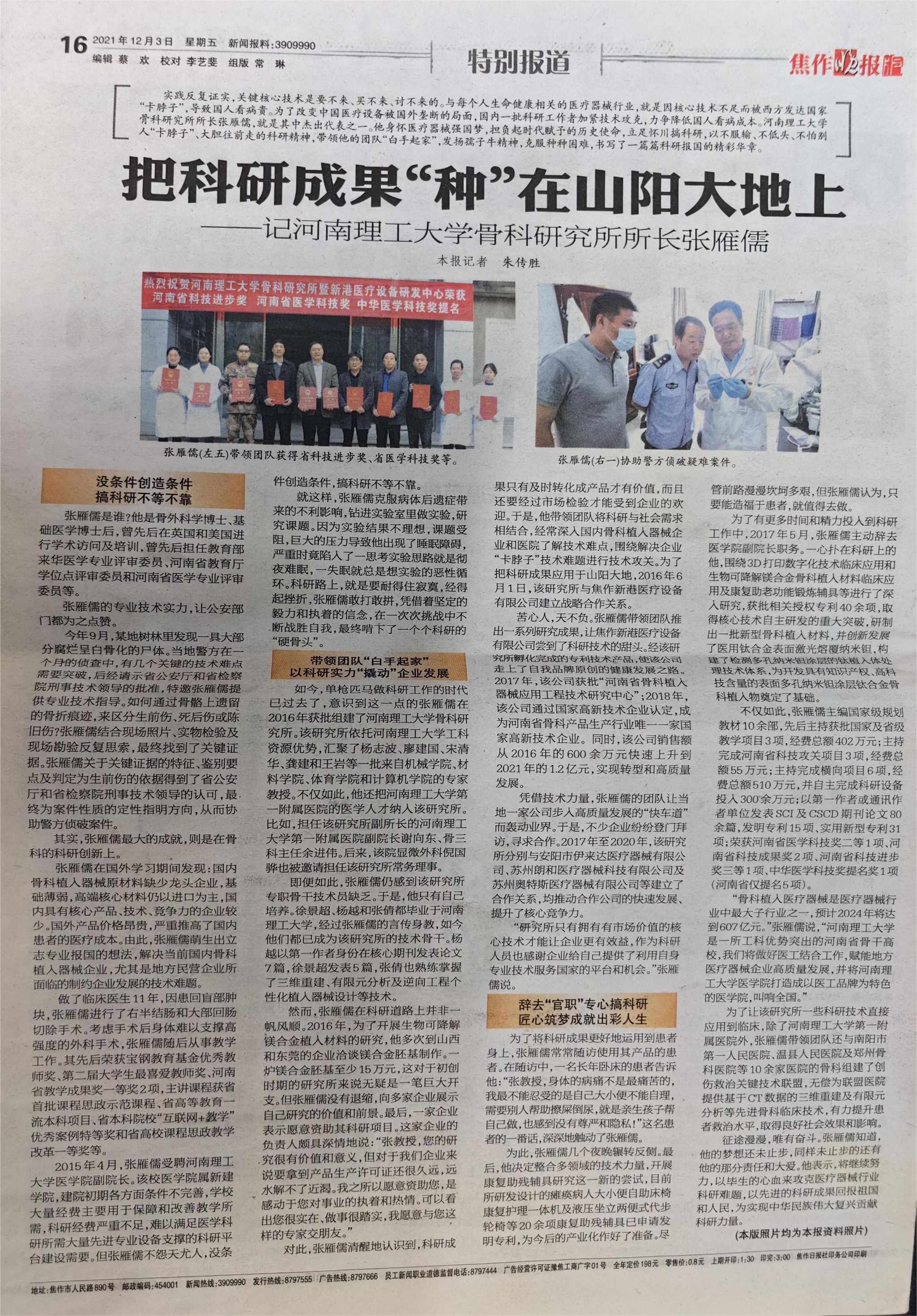 苦心人,天不负。张雁儒带领研究所专家团队,推出一系列研究成果,让焦作新港医疗设备有限公司尝到了“科研技术”的甜头。经骨科研究所孵化完成的专利技术产品,使企业彻底走上了自我品牌原创的健康发展之路。2017年,企业获批“河南省骨科植入器械应用工程技术研究中心”;2018年,企业通过国家高新技术企业认定,成为河南省骨科产品生产行业的唯一一家国家高新技术企业。同时,企业销售额从2016年600余万元/年快速上升到2021年1.2亿元/年,实现企业的转型和高质量发展。