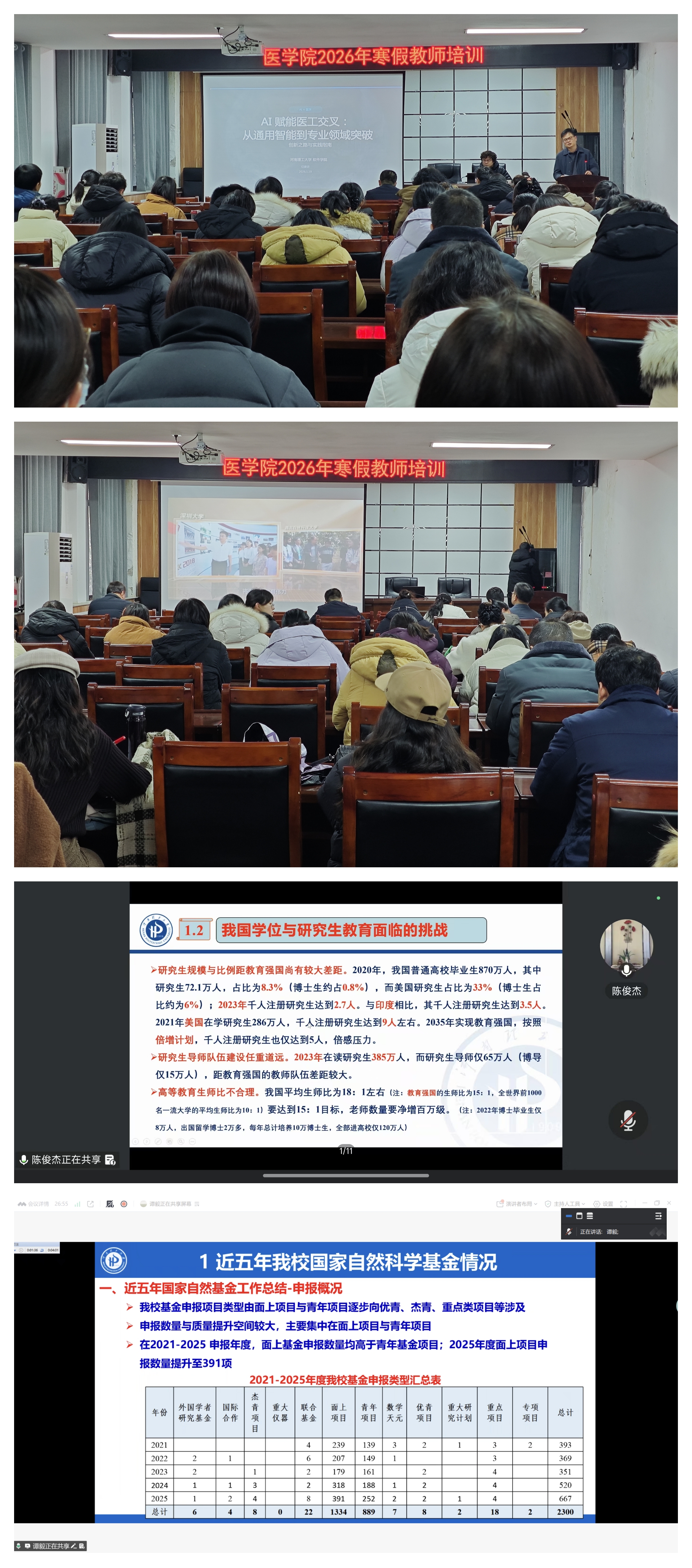 20日上午,学院邀请研究生院院长陈俊杰作《服务教育强国建设,加快推进学位与研究生教育高质量发展》的专题讲座。陈俊杰院长围绕学位与研究生教育新形势新任务,结合政策实践分析研究生分类培养、专业学位教育等关键议题,与导师探讨新时代导师必备素质能力,为学院优化培养体系、提升育人质量明确方向。下午,邀请科技处谭毅副处长作《凝智聚慧搞科研 守正创新提质效》的专题讲座。他首先梳理近五年我校国家自然科学基金的申报与立项数据,剖析趋势规律;随后解读科研项目及资金管理办法,明确规范要求,为科研人员合规开展工作提供指引;最后围绕河南省科技奖申报要点,从材料撰写、成果提炼到注意事项逐一讲解,助力提升项目立项率。