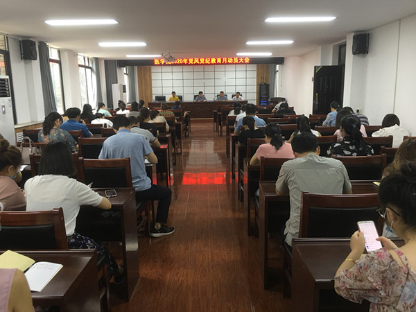 会议首先传达了《医学院2020年党风党纪教育月活动方案》,并进行了具体安排部署。要求广大党员深入学习习近平总书记有关疫情防控和教育工作的重要批示指示精神,《中国共产党问责条例》《党委(党组)落实全面从严治党主体责任规定》等党规党纪。随后,余本胜对此次活动提出以下要求:一扛抗牢疫情防控责任;二是高度重视,主动作为;三是细化方案,迅速行动;四是加强宣传,营造氛围。