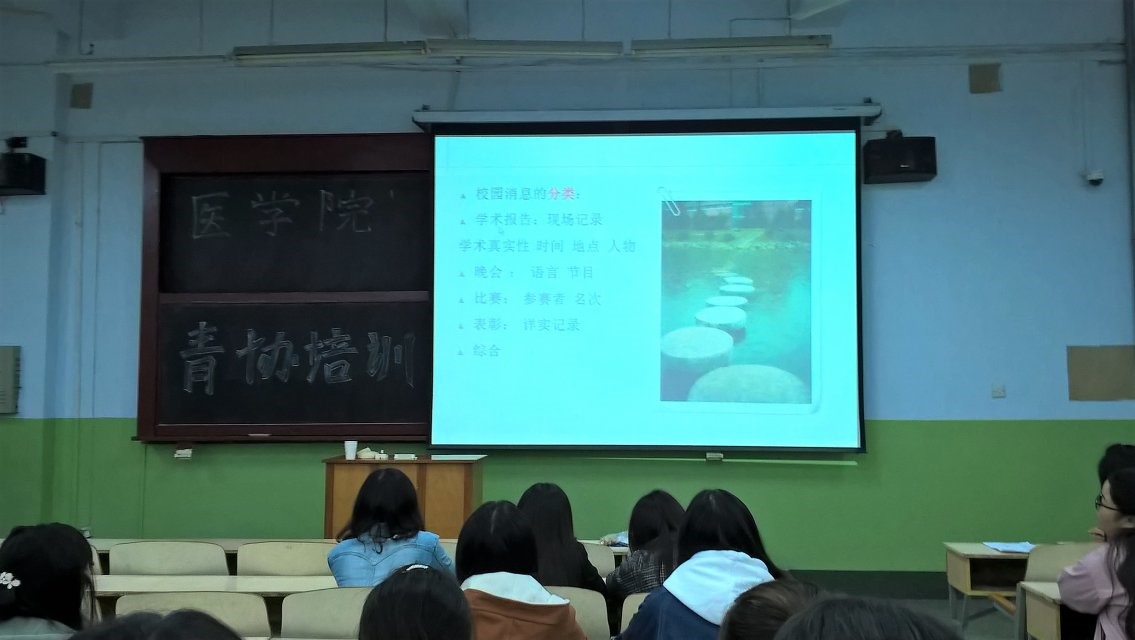 为了提高青协新成员新闻稿、策划书和总结的质量,我院青协于10月23日下午4点在北校区2号教学楼2104教室举行了首次培训,各部门部长以及学生会陆枭、大通社马凤颖出席本次培训,青协全体成员参加。