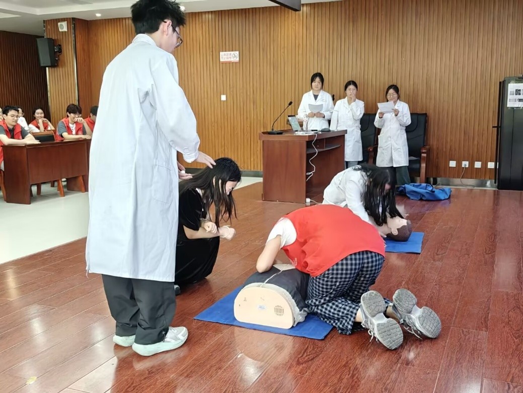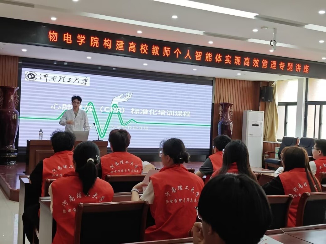 为深入推进校园生命安全教育,全面提升广大学生应急自救与互助施救能力,切实筑牢校园安全防护屏障,4月19日,医学院青年志愿者协会专项志愿服务团队前往物理与电子信息学院(物电学院)226会议室,开展心肺复苏(CPR)专项急救技能培训活动。物电学院全体宿舍长、学生志愿者骨干及各班级学生代表全程参与。